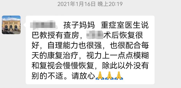 術(shù)后三天:曉意術(shù)后恢復(fù)很好,自理能力強(qiáng),同步也在進(jìn)行康復(fù)治療,視力模糊和復(fù)視也在一點(diǎn)點(diǎn)康復(fù)。