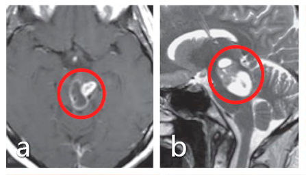 術(shù)前:a、b圖患者術(shù)前MRI顯示中腦腫瘤,患者較初接受立體定向囊腫抽吸和間質(zhì)放療,并被診斷為毛細胞型星形細胞瘤,但腫瘤仍在生長。