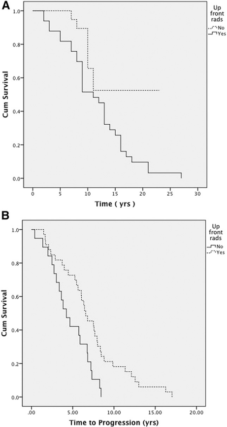 A,前期放療與惡化的總生存率相關(guān)(16.6±1.6比11.4±1.0年;P=.03).