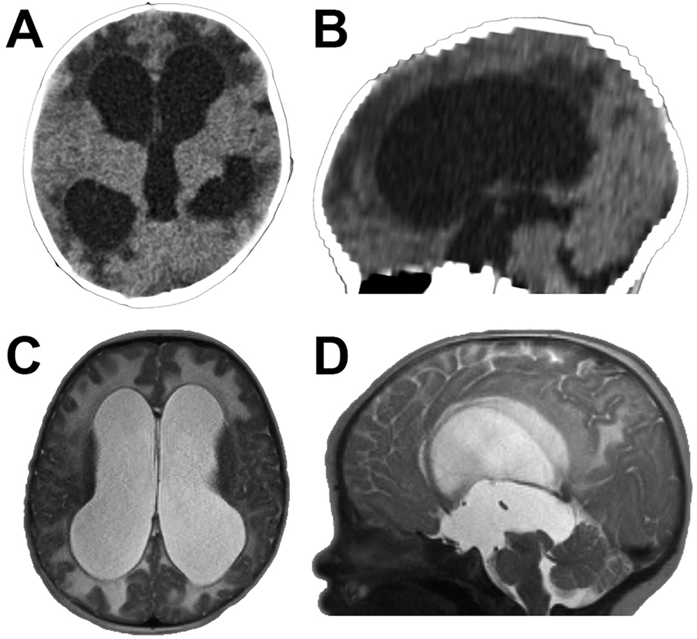 圖1:表現(xiàn)為明顯的導(dǎo)水管狹窄。A和B:CT軸位(A)和矢狀位(B),患者2個(gè)月時(shí)一次就診,顯示三腦室擴(kuò)大。C和D:初診時(shí)獲得軸向(C)和矢狀(D)t2加權(quán)MR圖像,顯示三腦室擴(kuò)大,四腦室大小正常,嘴側(cè)腦導(dǎo)水管變細(xì),與導(dǎo)水管狹窄一致。