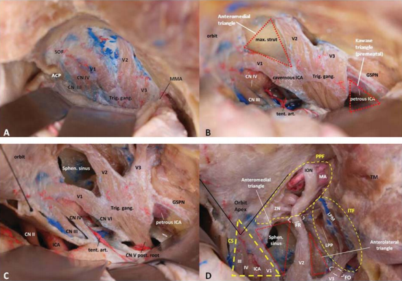 圖2:逐步解剖海綿狀竇和顱中窩暴露。(A)海綿竇側(cè)壁剝離,顯示顱神經(jīng)(CN)III、IV和V1進(jìn)入眶上裂(SOF)和V2、V3。腦膜中動脈(MMA)位于V3后方,從棘孔出。(B)暴露V1和V2之間的前內(nèi)側(cè)三角和巖尖鉆孔,暴露巖性頸內(nèi)動脈(ICA)。梅克爾腔的上壁被剝離。(C)蝶竇(SS/Sphen.sinus);前內(nèi)側(cè)三角(V1-V2)鉆孔后暴露。(D)鉆孔前外側(cè)三角(V2-V3)和打開圓孔(FR)、卵圓孔(FO)后的暴露。翼腭窩(PPF)和上頜神經(jīng)的整個(gè)通路被暴露,直到它到達(dá)眶下溝。