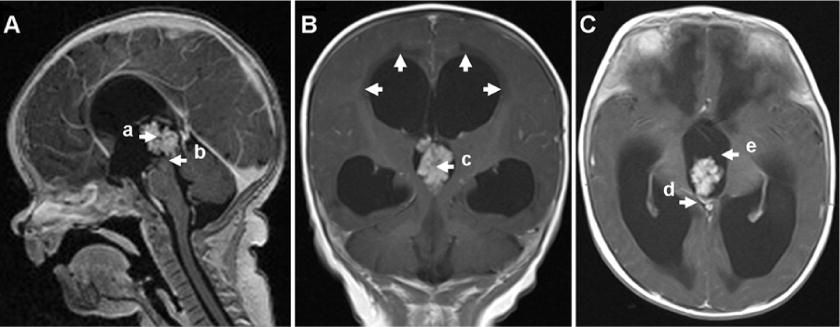 圖1:術(shù)前MRI與靜脈造影對比。A:矢狀面顯示腫瘤(A)位于三腦室后部。腫瘤穿透(b)進(jìn)入大腦導(dǎo)水管導(dǎo)致堵塞。B:冠狀圖顯示三腦室菜花樣腫瘤結(jié)節(jié)(c),腦積水。箭頭表示心室周圍水腫。C:軸向圖像顯示腫瘤血管蒂(d)。注意腫瘤與三腦室大小的關(guān)系(e)。