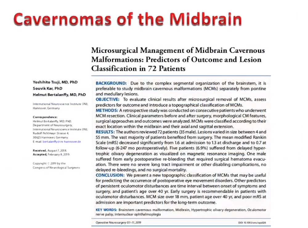巴特朗菲教授(Helmut Bertalanffy)教授在其近期的Microsurgical Management of Midbrain Cavernous Malformations:Predictors of Outcome andLesion Classification in 72 Patients論文中記錄了他關(guān)于中