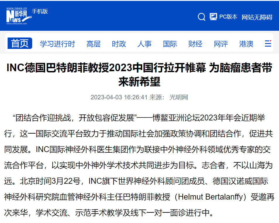 “團結(jié)合作迎挑戰(zhàn),開放包容促發(fā)展”——博鰲論壇2023年年會近期舉行,這一國際交流平臺致力于推動國際社會加強政策協(xié)調(diào)和團結(jié)合作,促進共同發(fā)展。INC國際神經(jīng)外科醫(yī)生集團作為聯(lián)接中外神經(jīng)外科領(lǐng)域?qū)<业慕涣骱献髌脚_,以實現(xiàn)中外神外學(xué)術(shù)技術(shù)共同進步為目標(biāo)。志合者,不以山海為遠。北京時間3月22號,INC旗下國際神經(jīng)外科顧問團成員、德國漢諾威國際神經(jīng)外科研究院血管神經(jīng)外科主任巴特朗菲教授(Helmut Bertalanffy)受邀再次來華,學(xué)術(shù)交流、示范手術(shù)教學(xué)及線下一對一咨詢進行中。