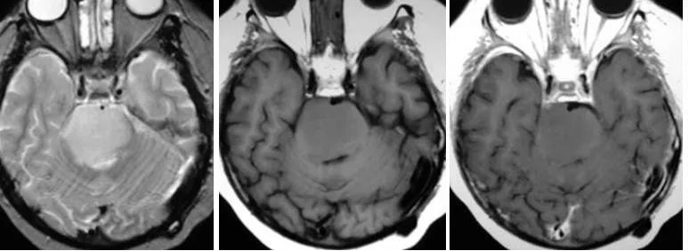 1、腦干毛細胞型星形細胞瘤:兒童患者較常見的神經膠質腫瘤,也是較常見累及小腦的腫瘤。值得一提的是該腫瘤有良性的生物行為,10年生存率達94%,大部分發(fā)生于20歲以前患者。小腦、視神經、視交叉及下丘腦是較常見的發(fā)病部位,但是該腫瘤也可發(fā)生于大腦半球、腦室及腦干。MRI通常表現(xiàn)為囊性腫塊伴壁結節(jié)強化,有時候也表現(xiàn)為實性腫塊無瘤周水腫,在腦干,其通常累及中腦及延髓,而浸潤型膠質瘤通常累及腦橋。