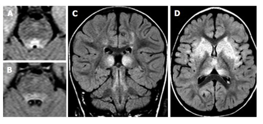 (橫斷位T2WI示腦干區(qū)高信號病灶)