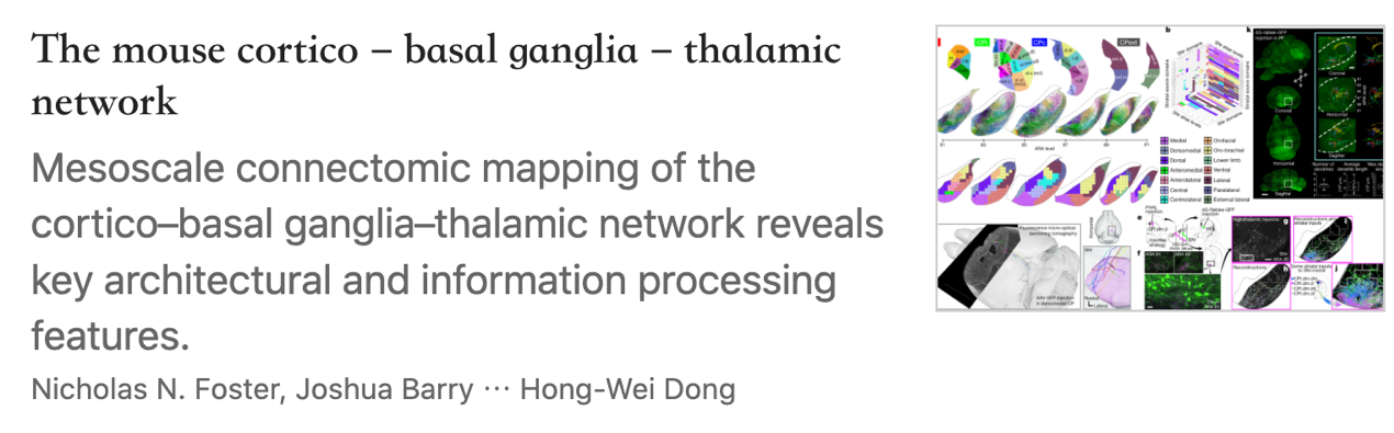 研究九:The mouse cortico–basal ganglia–thalamic network。鑒定了六個(gè)并行的皮質(zhì)-基底核-丘腦網(wǎng)絡(luò)。