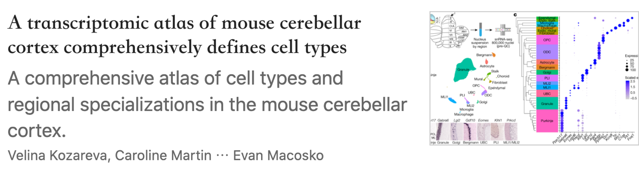 研究十六:A transcriptomic atlas of mouse cerebellar cortex comprehensively defines cell types.該研究利用高通量測(cè)序研究了小鼠小腦不同葉區(qū)不同細(xì)胞類型的分子圖譜,揭示了不同細(xì)胞類型獨(dú)特的分子特征,并將此特征與生理特征進(jìn)行了聯(lián)系。
